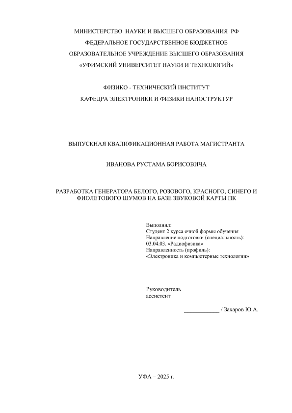 Иванов, Рустам Борисович. Разработка генератора белого, розового, красного, синего и фиолетового шума на базе звуковой карты: выпускная квалификационная работа по программе магистратуры. Направление подготовки: 03.04.03 Радиофизика. Направленность: Электроника и компьютерные технологии / Р.Б. Иванов; Уфимский университет науки и технологий, Физико-технический институт, Кафедра электроники и физики наноструктур ; научный руководитель: Ю.А. Захаров. — Уфа, 2025. — 63 с.: ил. — <URL:https://elib.bashedu.ru/dl/diplom/2025/Ivanov.R.B.03_04_03_Radiofizika_2025.pdf>. — Текст: электронныйДата создания записи: 07.10.2025 Тематика: магистратура; ВКР; звуковая карта ПК; спектральный анализ; цветные шумы; генератор; язык программирования Коллекции: Магистерские диссертации; Общая коллекция Разрешенные действия: –