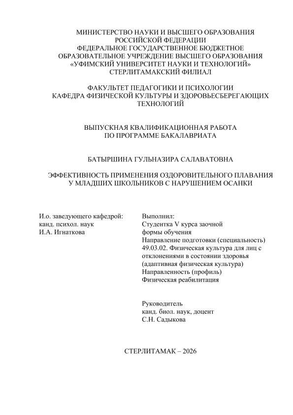 физическая культура). Программа: Физическая реабилитация / Г. С. Батыршина; Уфимский университет науки и технологий, Стерлитамакский филиал, Факультет педагогики и психологии, Кафедра физической культуры и здоровьесберегающих технологий, научный руководитель С. Н. Садыкова. — Стерлитамак, 2026. — 41 с. — <URL:https://elib.bashedu.ru/dl/diplom/SF/2026/FPIP/BatyrshinaGS_49_03_02_ZSAFK51_bak_2026_VKR.pdf>. — текст: электронный