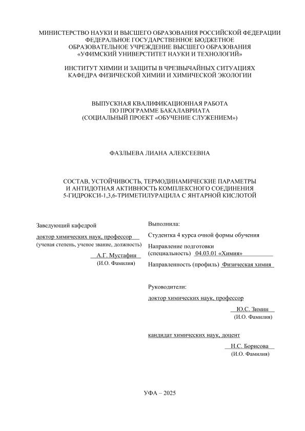 Фазлыева, Лиана Алексеевна. Состав, устойчивость, термодинамические параметры и антидотная активность комплексного соединения 5-гидрокси-1,3,6-триметилурацила с янтарной кислотой (СОЦИАЛЬНЫЙ ПРОЕКТ «ОБУЧЕНИЕ СЛУЖЕНИЕМ»): выпускная квалификационная работа по программе специалитета. Направление подготовки 04.03.01 «Химия» Направленность (профиль): "Физическая химия" / Л.А. Фазлыева; Уфимский университет науки и технологий, Институт химии и защиты в чрезвычайных ситуациях ; Кафедра физической химии и химической экологии; научные руководители: Ю. С. Зимин; Н.С. Борисова. — Уфа, 2025. — 72 с. — <URL:https://elib.bashedu.ru/dl/diplom/2025/Fazlyeva_LA_4FH211B_04.03.01_Khimiya_06.2025.pdf>. — Текст: электронный