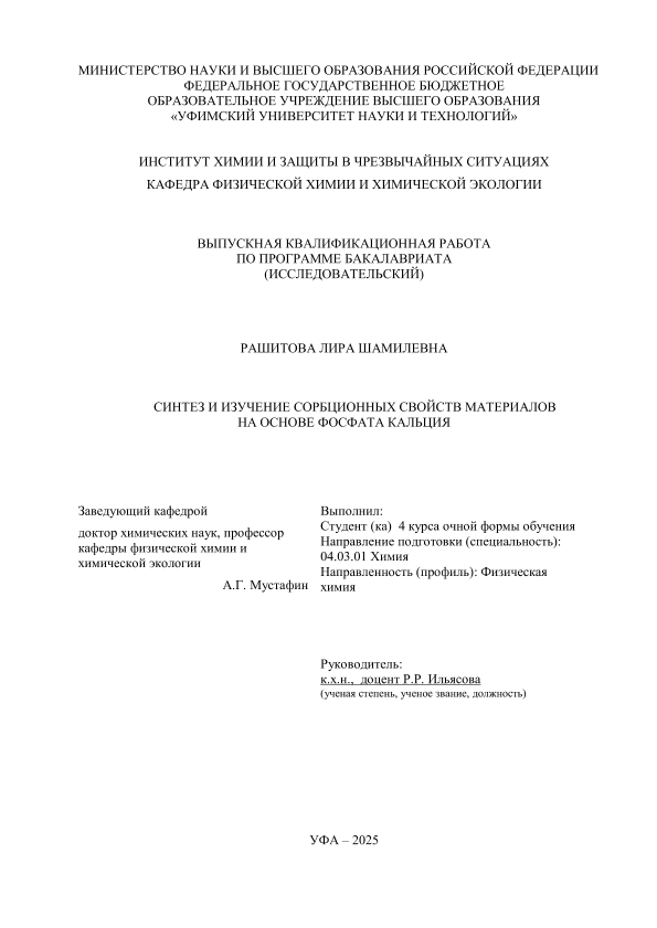 Рашитова, Лира Шамилевна. Синтез и изучения сорбционных свойств материалов на основе фосфата кальция: выпускная квалификационная работа по программе бакалавриата. Направление подготовки 04.03.01: "Химия". Направленность (профиль): "Физическая химия" / Л.Ш. Рашитова; Уфимский университет науки и технологий, Институт химии и защиты в чрезвычайных ситуациях ; Кафедра физической химии и химической экологии; научный руководитель: Р.Р. Ильясова. — Уфа, 2025. — 58 с. — <URL:https://elib.bashedu.ru/dl/diplom/2025/Rashitova_LSh_4FH211B_04.03.01_Khimiya_06.2025.pdf>. — Текст: электронный