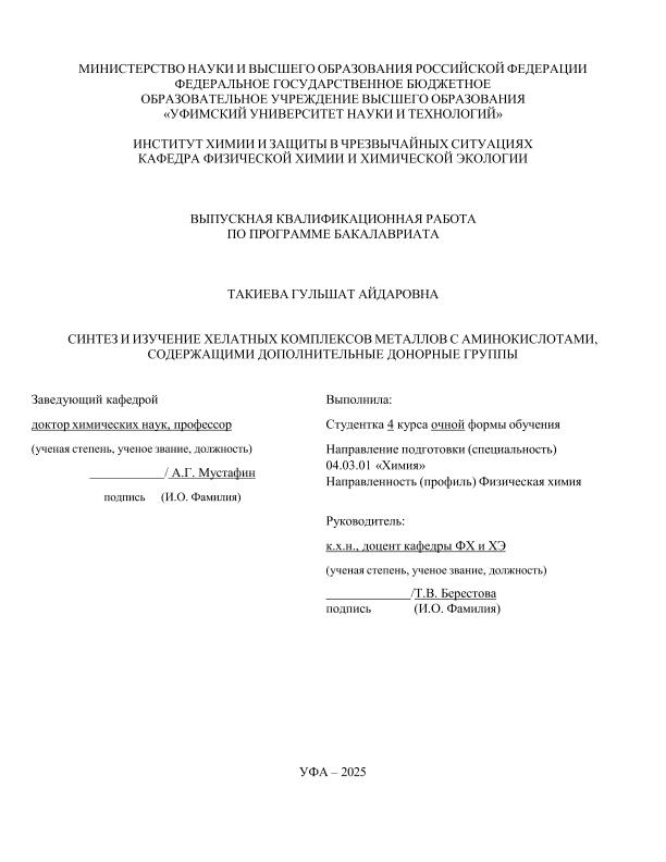 Такиева, Гульшат Айдаровна. Синтез и изучение хелатных комплексов металлов с аминокислотами, содержащими дополнительные донорные группы: выпускная квалификационная работа по программе бакалавриата. Направление подготовки 04.03.01: "Химия". Направленность (профиль): "Физическая химия" / Г.А. Такиева; Уфимский университет науки и технологий, Институт химии и защиты в чрезвычайных ситуациях ; Кафедра физической химии и химической экологии; научный руководитель: Т.В. Берестова. — Уфа, 2025. — 54 с. — <URL:https://elib.bashedu.ru/dl/diplom/2025/Takieva_GA_4FH211B_04.03.01_Khimiya_06.2025.pdf>. — Текст: электронный
