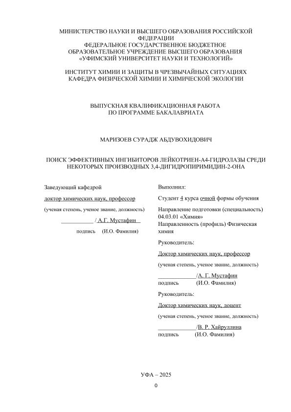 Маризоев, Сурадж Абдувохидович. Поиск эффективных ингибиторов лейкотриен-А4-гидролазы среди некоторых производных 3,4-дигидропиримидин-2-она: выпускная квалификационная работа по программе бакалавриата. Направление подготовки 04.03.01: "Химия". Направленность (профиль): "Физическая химия" / С.А. Маризоев; Уфимский университет науки и технологий, Институт химии и защиты в чрезвычайных ситуациях ; Кафедра физической химии и химической экологии; научные руководители: А.Г. Мустафин; В.Р. Хайруллина. — Уфа, 2025. — 52 с. — <URL:https://elib.bashedu.ru/dl/diplom/2025/Marizoev_SA_4FH211B_04.03.01_Khimiya_06.2025.pdf>. — Текст: электронный