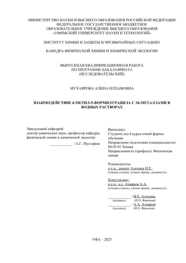 Мухаярова, Алина Илхамовна. Взаимодействие 6-метил-5-формилурацила с 3d-металлами в водных растворах: выпускная квалификационная работа по программе бакалавриата. Направление подготовки 04.03.01: "Химия". Направленность (профиль): "Физическая химия" / А.И. Мухаярова; Уфимский университет науки и технологий, Институт химии и защиты в чрезвычайных ситуациях ; Кафедра физической химии и химической экологии; научный руководитель: И.С. Файзрахманов ; консультант: А.А. Ахияров. — Уфа, 2025. — 47 с. — <URL:https://elib.bashedu.ru/dl/diplom/2025/Mukhayarova_AI_4FH211B_04.03.01_Khimiya_06.2025.pdf>. — Текст: электронный