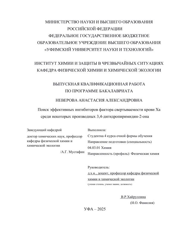 Неверова, Анастасия Александровна. Поиск эффективных ингибиторов фактора свертываемости крови Xa среди некоторых производных 3,4-дигидропиримидин-2-она: выпускная квалификационная работа по программе бакалавриата. Направление подготовки 04.03.01: "Химия". Направленность (профиль): "Физическая химия" / А.А. Неверова; Уфимский университет науки и технологий, Институт химии и защиты в чрезвычайных ситуациях ; Кафедра физической химии и химической экологии; научный руководитель: В.Р. Хайруллина. — Уфа, 2025. — 61 с. — <URL:https://elib.bashedu.ru/dl/diplom/2025/Neverova_AA_4FH211B_04.03.01_Khimiya_06.2025.pdf>. — Текст: электронный