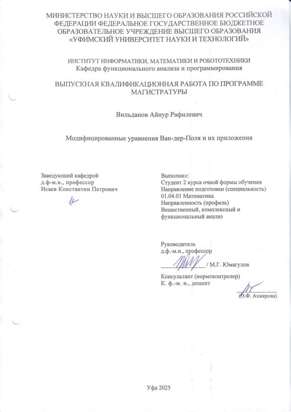 Вильданов, Айнур Рафилевич. Модификация модели Ван-дер-Поля и их приложения: выпускная квалификационная работа по программе магистратура. Направление подготовки (специальность) 01.04.01 "Математика". Направленность: " Вещественный, комплексный и функциональный анализ" / А. Р. Вильданов; Уфимский университет науки и технологий, Институт информатики, математики и робототехники, Кафедра функционального анализа и программирования; научный руководитель М. Г. Юмагулов; консультант: Э.Ф. Ахмерова. — Уфа, 2025. — 26 с. — <URL:https://elib.bashedu.ru/dl/diplom/2025/Vildanov_A_R_M-VKF201M_010401_06.2025.pdf>. — Текст: электронный