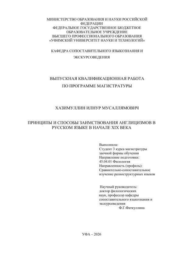 Хазимуллин, Илнур Мусаллямович. Принципы и способы заимствований англицизмов в русском языке начала XXI века: выпускная квалификационная работа по программе магистратуры. Направление подготовки (специальность) 45.04.01 "Филология". Направленность (профиль): "Сравнительно-сопоставительное изучение разноструктурных языков" / И.М. Хазимуллин; Уфимский университет науки и технологий, Факультет башкирской филологии, востоковедения и журналистики, Кафедра сопоставительного языкознания и экскурсоведения; научный руководитель Ф. Г. Фаткуллина. — Уфа, 2026. — 88 с. — <URL:https://elib.bashedu.ru/dl/diplom/2026/Khazimullin_IM_IVT_45.04.01_Filologija_mag_2026.pdf>. — Текст: электронный