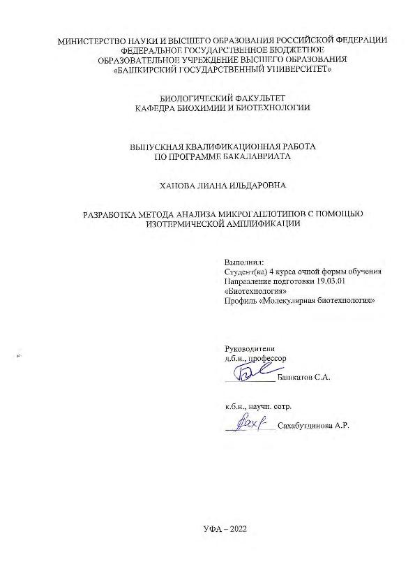 Ханова, Лиана Ильдаровна. Разработка метода анализа микрогаплотипов с помощью изотермической амплификации: выпускная квалификационная работа по программе бакалавриата. Направление подготовки (специальность) 19.03.01 "Биотехнология". Направленность (профиль): "Молекулярная биотехнология" / Л. И. Ханова; Башкирский государственный университет, Биологический факультет, Кафедра биохимии и биотехнологии ; научные руководители: С. А. Башкатов, А. Р. Сахабутдинова. — Уфа, 2022. — 42 с. — <URL:https://elib.bashedu.ru/dl/diplom/2022/Khanova LI_19.03.01_Biotekhnologija_bak_2022.pdf>. — Текст: электронный