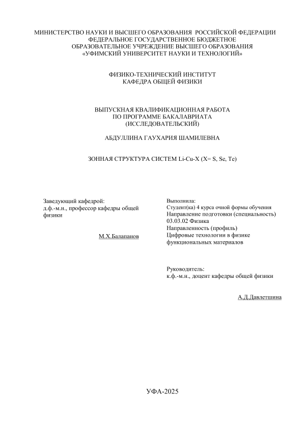 Абдуллина, Гаухария Шамилевна. Зонная структура систем Li-Cu-X (X=S, Se, Te): выпускная квалификационная работа по программе бакалавриата. Направление подготовки (специальность) 03.03.02 "Физика". Направленность (профиль) "Цифровые технологии в физике функциональных материалов" / Г. Ш. Абдуллина; Уфимский университет науки и технологий, Физико-технический институт, Кафедра общей физики; научный руководитель А. Д. Давлетшина. — Уфа, 2025. — 38 с. — <URL:https://elib.bashedu.ru/dl/diplom/2025/Abdullina_GSh_FZ-4FFM211B_03_03_02_Fizika_06_2025.pdf>. — Текст: электронный