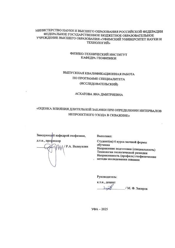 Асхатова, Яна Дмитриевна. Оценка влияния длительной закачки при определении интервалов непроектного ухода в скважине: выпускная квалификационная работа по программе специалитета. Направление подготовки (специальность): 21.05.03 "Технология геологической разведки". Направленность (профиль): "Геофизические методы исследования скважин" / Я. Д. Асхатова; Уфимский университет науки и технологий, Физико-технический институт, Кафедра геофизики; научный руководитель М. Ф. Закиров. — Уфа, 2025. — 51 с. — <URL:https://elib.bashedu.ru/dl/diplom/2025/AskhatovaYD_TGR-6GM211Sus_21.05.03_techgeorazv_spec_06.2025.pdf>. — Текст: электронный