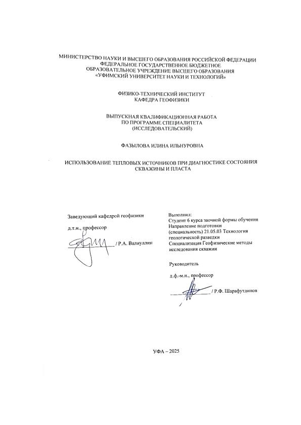 Фазылова, Илина Ильнуровна. Использование тепловых источников при диагностике состояния скважины и пласта: выпускная квалификационная работа по программе специалитета. Направление подготовки (специальность): 21.05.03 "Технология геологической разведки". Направленность (профиль): "Геофизические методы исследования скважин" / И. И. Фазылова; Уфимский университет науки и технологий, Физико-технический институт, Кафедра геофизики; научный руководитель Р. Ф. Шарафутдинов. — Уфа, 2025. — 48 с. — <URL:https://elib.bashedu.ru/dl/diplom/2025/FazylovaII_TGR-6GM191Sz_21.05.03_techgeorazv_spec_06.2025.pdf>. — Текст: электронный