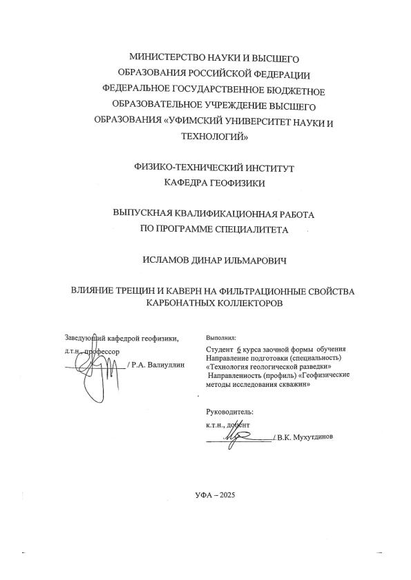 Исламов, Динар Ильмарович. Влияние трещин и каверн на фильтрационные свойства карбонатных коллекторов: выпускная квалификационная работа по программе специалитета. Направление подготовки (специальность): 21.05.03 "Технология геологической разведки". Направленность (профиль): "Геофизические методы исследования скважин" / Д. И. Исламов; Уфимский университет науки и технологий, Физико-технический институт, Кафедра геофизики; научный руководитель В. К. Мухутдинов. — Уфа, 2025. — 66 с. — <URL:https://elib.bashedu.ru/dl/diplom/2025/IslamovDI_TGR-6GM191Sz_21.05.03_techgeorazv_spec_06.2025.pdf>. — Текст: электронный