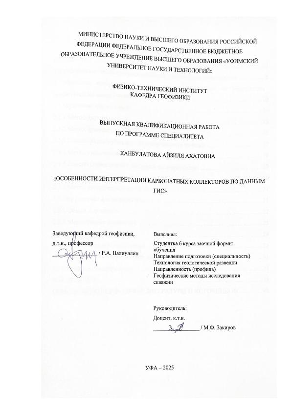Канбулатова, Айзиля Ахатовна. Особенности интерпретации карбонатных коллекторов по данным ГИС: выпускная квалификационная работа по программе специалитета. Направление подготовки (специальность): 21.05.03 "Технология геологической разведки". Направленность (профиль): "Геофизические методы исследования скважин" / А. А. Канбулатова; Уфимский университет науки и технологий, Физико-технический институт, Кафедра геофизики; научный руководитель М. Ф. Закиров. — Уфа, 2025. — 42 с. — <URL:https://elib.bashedu.ru/dl/diplom/2025/KanbulatovaAA_TGR-6GM191Sz_21.05.03_techgeorazv_spec_06.2025.pdf>. — Текст: электронный