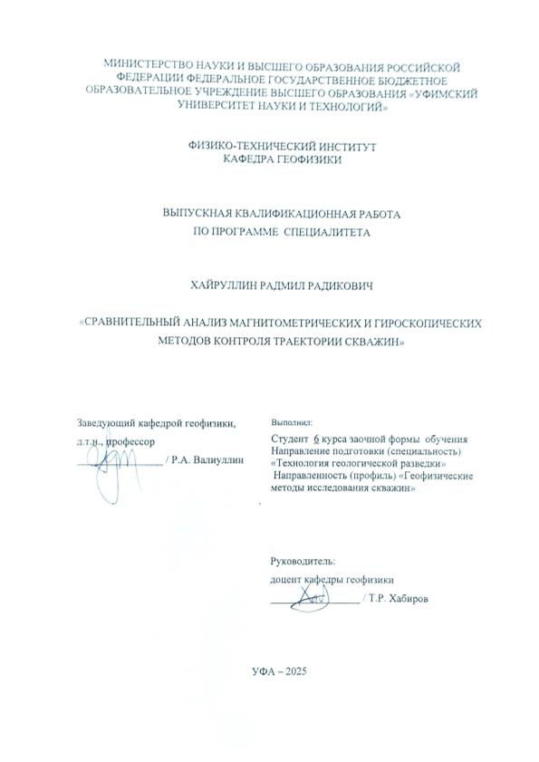 Хайруллин, Радмил Радикович. Сравнительный анализ магнитометрических и гироскопических методов контроля траектории скважин: выпускная квалификационная работа по программе специалитета. Направление подготовки (специальность): 21.05.03 "Технология геологической разведки". Направленность (профиль): "Геофизические методы исследования скважин" / Р. Р. Хайруллин; Уфимский университет науки и технологий, Физико-технический институт, Кафедра геофизики; научный руководитель Т. Р. Хабиров. — Уфа, 2025. — 85 с. — <URL:https://elib.bashedu.ru/dl/diplom/2025/KhairullinRR_TGR-6GM191Sz_21.05.03_techgeorazv_spec_06.2025.pdf>. — Текст: электронный