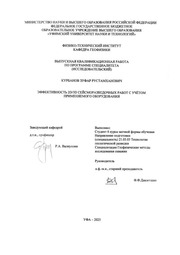 Курбанов, Зуфар Рустамханович. Эффективность 2D/3D сейсморазведочных работ с учетом применяемого оборудования: выпускная квалификационная работа по программе специалитета. Направление подготовки (специальность): 21.05.03 "Технология геологической разведки". Направленность (профиль): "Геофизические методы исследования скважин" / З. Р. Курбанов; Уфимский университет науки и технологий, Физико-технический институт, Кафедра геофизики; научный руководитель Ф. Ф. Давлетшин. — Уфа, 2025. — 80 с. — <URL:https://elib.bashedu.ru/dl/diplom/2025/KurbanovZR_TGR-6GM191Sz_21.05.03_techgeorazv_spec_06.2025.pdf>. — Текст: электронный