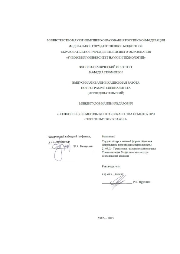 Миндигулов, Наиль Ильдарович. Геофизические методы контроля качества цемента при строительстве скважин: выпускная квалификационная работа по программе специалитета. Направление подготовки (специальность): 21.05.03 "Технология геологической разведки". Направленность (профиль): "Геофизические методы исследования скважин" / Н. Н. Миндигулов; Уфимский университет науки и технологий, Физико-технический институт, Кафедра геофизики; научный руководитель Р. К. Яруллин. — Уфа, 2025. — 54 с. — <URL:https://elib.bashedu.ru/dl/diplom/2025/MindigulovNI_TGR-6GM191Sz_21.05.03_techgeorazv_spec_06.2025.pdf>. — Текст: электронный