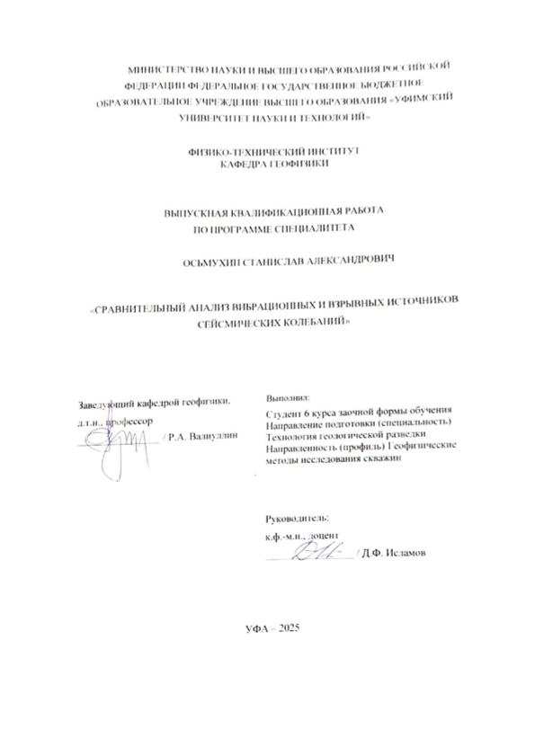 Осьмухин, Станислав Александрович. Сравнительный анализ вибрационных и взрывных источников сейсмических колебаний: выпускная квалификационная работа по программе специалитета. Направление подготовки (специальность): 21.05.03 "Технология геологической разведки". Направленность (профиль): "Геофизические методы исследования скважин" / С. А. Осьмухин; Уфимский университет науки и технологий, Физико-технический институт, Кафедра геофизики; научный руководитель Д. Ф. Исламов. — Уфа, 2025. — 54 с. — <URL:https://elib.bashedu.ru/dl/diplom/2025/OsmukhinSA_TGR-6GM191Sz_21.05.03_techgeorazv_spec_06.2025.pdf>. — Текст: электронный