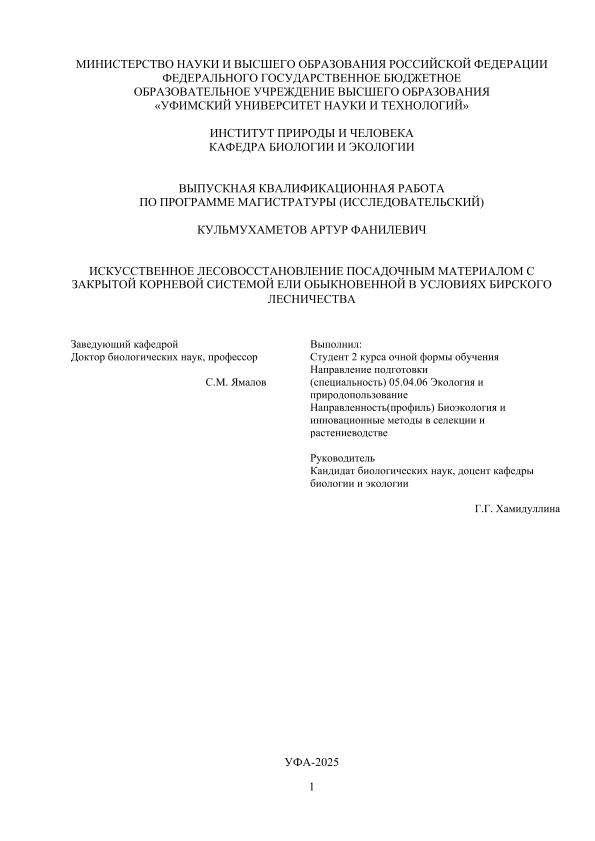 Кульмухаметов, Артур Фанилевич. Искусственное лесовосстановление посадочным материалом с закрытой корневой системой Ели обыкновенной в условиях Бирского лесничества: выпускная квалификационная работа по программе магистратуры. Направление подготовки (специальность) 05.04.06 "Экология и природопользование". Направленность (профиль) "Биоэкология и инновационные методы в селекции и растениеводстве" / А. Ф. Кульмухаметов; Уфимский университет науки и технологий, Институт природы и человека, Кафедра биологии и экологии; научный руководитель Г. Г. Хамидуллина. — Уфа, 2025. — 87 с. — <URL:https://elib.bashedu.ru/dl/diplom/2025/Kulmuhametov_AF_05.04.06_Ekologiya_i_prirodopolzovanie.pdf>. — Текст: электронный
