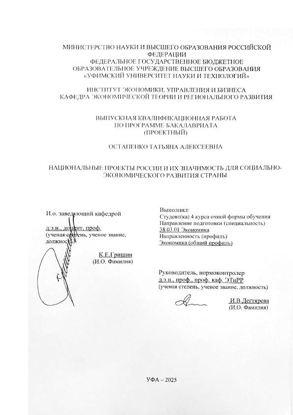 Остапенко, Татьяна Алексеевна. Национальные проекты России и их значимость для социально-экономического развития страны (проектный): выпускная квалификационная работа по программе бакалавриата. Направление подготовки (специальность) 38.03.01 "Экономика". Направленность (профиль) "Экономика (общий профиль)" / Т.А. Остапенко; Уфимский университет науки и технологий, Институт экономики, управления и бизнеса, Кафедра экономической теории и регионального развития ; научный руководитель  И.В. Дегтярева. — Уфа, 2025. — 75 с. — <URL:https://elib.bashedu.ru/dl/diplom/2025/Ostapenko_TA_E-493B_38.03.01_Ekonomika_06.2025.pdf>. — Текст: электронный