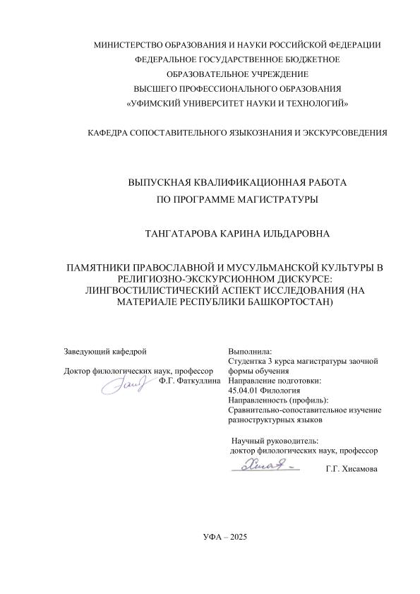 Тангатарова, Карина Ильдаровна. Памятники православной и мусульманской культуры в религиозно-экскурсионном дискурсе: лингвостилистический аспект исследования (на материале Республики Башкортостан): выпускная квалификационная работа по программе магистратуры. Направление подготовки (специальность) 45.04.01 "Филология". Направленность (профиль): "Сравнительно-сопоставительное изучение разноструктурных языков" / К. И. Тангатарова; Уфимский университет науки и технологий, Факультет башкирской филологии, востоковедения и журналистики, Кафедра сопоставительного языкознания и экскурсоведения; научный руководитель Г. Г. Хисамова. — Уфа, 2025. — 78 с. — <URL:https://elib.bashedu.ru/dl/diplom/2025/Tangatarova_KI_FL-3SRYA211-M3_45.04.01_Filologiya_01.2025.pdf>. — Текст: электронный