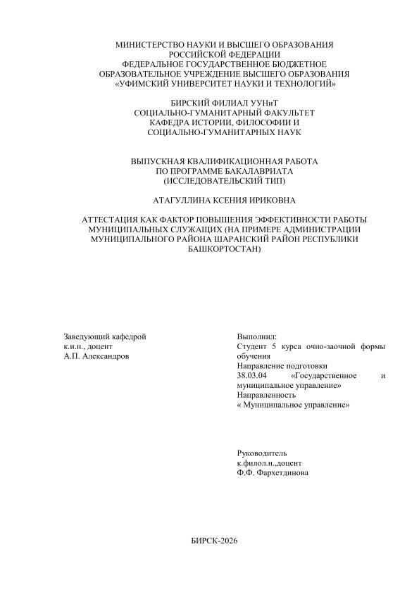Атагуллина, Ксения Ириковна. Аттестация как фактор повышения эффективности работы муниципальных служащих (на примере Администрации муниципального района Шаранский район Республики Башкортостан): выпускная квалификационная работа бакалавра по направлению подготовки 38.03.04 «Государственное и муниципальное управление», направленность (профиль) «Муниципальное управление» / К. И. Атагуллина; Уфимский университет науки и технологий, Бирский филиал ; научный руководитель Ф. Ф. Фархетдинова. — Бирск, 2026. — 50 с.: ил. — <URL:https://elib.bashedu.ru/dl/diplom/bf/2026/Atagullina _KI_38.03.04_GMU_02.2026.pdf>. — Текст: электронный