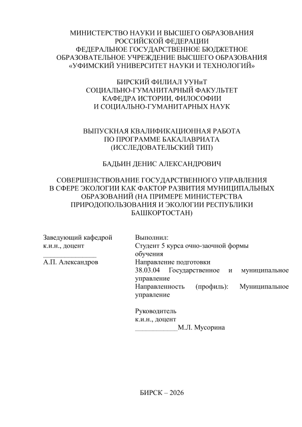 Бадьин, Денис Александрович. Совершенствование государственного управления в сфере экологии как фактор развития муниципальных образований (на примере Министерства природопользования и экологии Республики Башкортостан): выпускная квалификационная работа бакалавра по направлению подготовки 38.03.04 «Государственное и муниципальное управление», направленность (профиль) «Муниципальное управление» / Д. А. Бадьин; Уфимский университет науки и технологий, Бирский филиал ; научный руководитель М. Л. Мусорина. — Бирск, 2026. — 78 с.: ил. — <URL:https://elib.bashedu.ru/dl/diplom/bf/2026/Badin_DA_38.03.04_GMU_02.2026.pdf>. — Текст: электронный