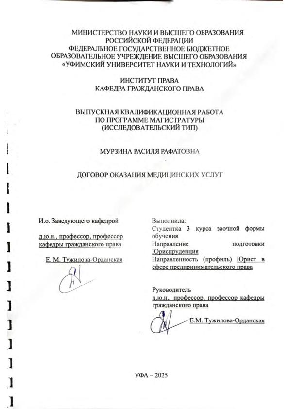 Мурзина, Расиля Рафатовна. Договор оказания медицинских услуг: выпускная квалификационная работа по программе магистратуры; направление подготовки (специальность) 40.04.01 Юриспруденция; направленность (профиль): Юрист в сфере предпринимательского права / Р.Р. Мурзина; Уфимский университет науки и технологий, Институт права, Кафедра гражданского права; научный руководитель Е.М. Тужилова-Орданская. — Уфа, 2026. — 84 с.: ил. — <URL:https://elib.bashedu.ru/dl/diplom/2026/Murzina_IO_PP-301mz_40.04.01_Yurisprudenciya_28.01.2026.pdf>. — текст: электронный