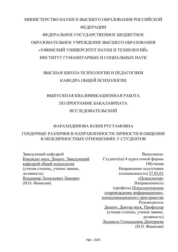 Фарахидинова, Юлия Рустамовна. Гендерные различия в направленности личности в общении в межличностных отношениях у студентов: выпускная квалификационная работа по программе бакалавриата. Направление подготовки: 37.03.01-Психология. Направленность (профиль): Психологическое сопровождение информационно-коммуникационного пространства / Ю.Р. Фарахидинова; Уфимский университет науки и технологий, Высшая школа философии, психологии и социологии, ИГСН; Кафедра общей психологии ; научный руководитель Л.Г. Дмитриева. — Уфа, 2025. — 81 с.: ил. — <URL:https://elib.bashedu.ru/dl/diplom/2025/Farakhidinova_IuR_P-4PS211B_37.03.01_Psi_Sopr_Inf_Kom_Prostr_07.2025.pdf>. — Текст: электронный