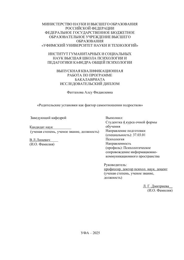 Фаттахова, Алсу Фидаилевна. Родительские установки как фактор самоотношения подростков: выпускная квалификационная работа по программе бакалавриата. Направление подготовки: 37.03.01-Психология. Направленность (профиль): Психологическое сопровождение информационно-коммуникационного пространства / А.Ф. Фаттахова; Уфимский университет науки и технологий, Высшая школа философии, психологии и социологии, ИГСН; Кафедра общей психологии ; научный руководитель Л.Г. Дмитриева. — Уфа, 2025. — 101 с.: ил. — <URL:https://elib.bashedu.ru/dl/diplom/2025/Fattakhova_AF_P-4PS211B_37.03.01_Psi_Sopr_Inf_Kom_Prostr_07.2025.pdf>. — Текст: электронный
