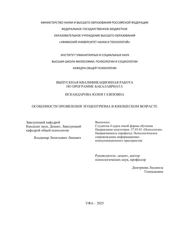 Искандарова, Юлия Газизовна. Особенности проявления эгоцентризма в юношеском возрасте: выпускная квалификационная работа по программе бакалавриата. Направление подготовки: 37.03.01-Психология. Направленность (профиль): Психологическое сопровождение информационно-коммуникационного пространства / Ю.Г. Искандарова; Уфимский университет науки и технологий, Высшая школа философии, психологии и социологии, ИГСН; Кафедра общей психологии ; научный руководитель Л.Г. Дмитриева. — Уфа, 2025. — 94 с.: ил. — <URL:https://elib.bashedu.ru/dl/diplom/2025/Iskandarova_IuG_P-4PS211B_37.03.01_Psi_Sopr_Inf_Kom_Prostr_07.2025.pdf>. — Текст: электронный