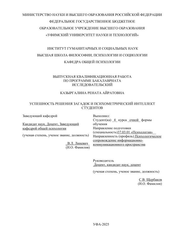 Казыргалина, Рената Айратовна. Успешность решения загадок и психометрический интеллект студентов: выпускная квалификационная работа по программе бакалавриата. Направление подготовки: 37.03.01-Психология. Направленность (профиль): Психологическое сопровождение информационно-коммуникационного пространства / Р.А. Казыргалина; Уфимский университет науки и технологий, Высшая школа философии, психологии и социологии, ИГСН; Кафедра общей психологии ; научный руководитель С.В. Щербаков. — Уфа, 2025. — 45 с.: ил. — <URL:https://elib.bashedu.ru/dl/diplom/2025/Kazyrgalina_RA_P-4PS211B_37.03.01_Psi_Sopr_Inf_Kom_Prostr_07.2025.pdf>. — Текст: электронный