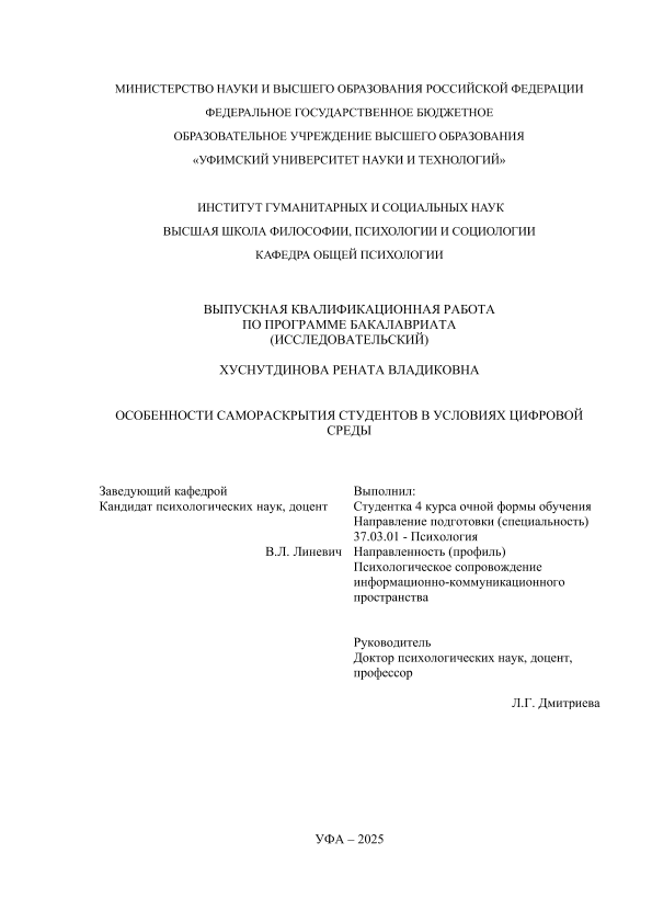 Хуснутдинова, Рената Владиковна. Особенности самораскрытия студентов в условиях цифровой среды: выпускная квалификационная работа по программе бакалавриата. Направление подготовки: 37.03.01-Психология. Направленность (профиль): Психологическое сопровождение информационно-коммуникационного пространства / Р.В. Хуснутдинова; Уфимский университет науки и технологий, Высшая школа философии, психологии и социологии, ИГСН; Кафедра общей психологии ; научный руководитель Л.Г. Дмитриева. — Уфа, 2025. — 100 с.: ил. — <URL:https://elib.bashedu.ru/dl/diplom/2025/Khusnutdinova_RV_P-4PS211B_37.03.01_Psi_Sopr_Inf_Kom_Prostr_07.2025.pdf>. — Текст: электронный