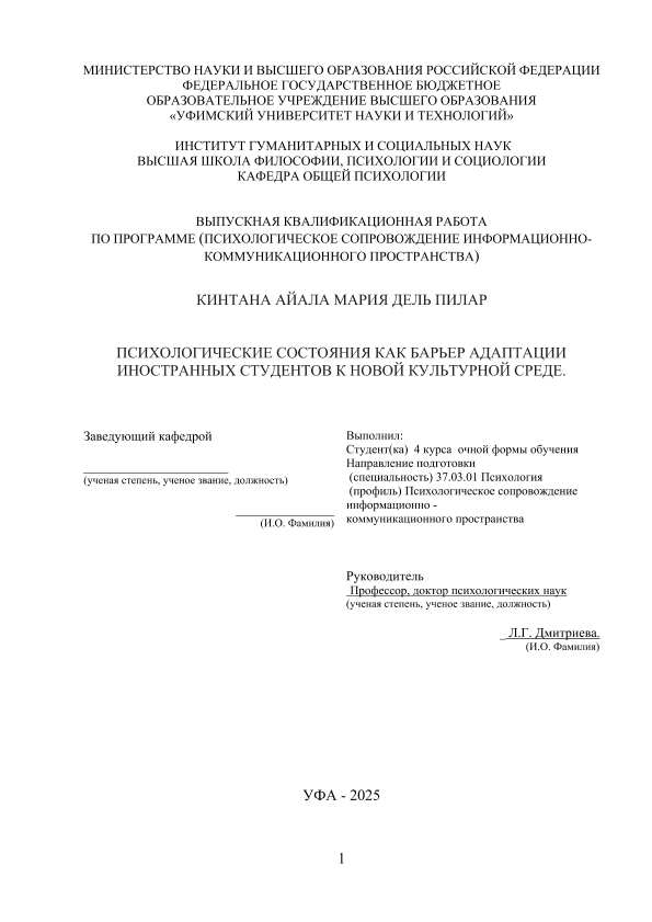 Кинтана, Айала Мария дель Пилар. Психологические состояния как барьер адаптации иностранных студентов к новой культурной среде: выпускная квалификационная работа по программе бакалавриата. Направление подготовки: 37.03.01-Психология. Направленность (профиль): Психологическое сопровождение информационно-коммуникационного пространства / Кинтана Айала Мария дель Пилар; Уфимский университет науки и технологий, Высшая школа философии, психологии и социологии, ИГСН; Кафедра общей психологии ; научный руководитель Л.Г. Дмитриева. — Уфа, 2025. — 87 с.: ил. — <URL:https://elib.bashedu.ru/dl/diplom/2025/Kintana_AMdP_P-4PS211B_37.03.01_Psi_Sopr_Inf_Kom_Prostr_07.2025.pdf>. — Текст: электронный