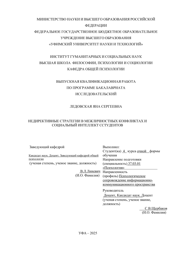 Ледовская, Яна Сергеевна. Недирективные стратегии в межличностных конфликтах и социальный интеллект студентов: выпускная квалификационная работа по программе бакалавриата. Направление подготовки: 37.03.01-Психология. Направленность (профиль): Психологическое сопровождение информационно-коммуникационного пространства / Я.С. Ледовская; Уфимский университет науки и технологий, Высшая школа философии, психологии и социологии, ИГСН; Кафедра общей психологии ; научный руководитель С.В. Щербаков. — Уфа, 2025. — 93 с.: ил. — <URL:https://elib.bashedu.ru/dl/diplom/2025/Ledovskaya_YS_P-4PS211B_37.03.01_Psi_Sopr_Inf_Kom_Prostr_07.2025.pdf>. — Текст: электронный