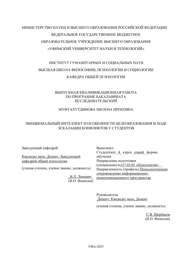 Муфтахутдинова, Милена Ирековна. Эмоциональный интеллект и особенности целеобразования в ходе эскалации конфликтов у студентов: выпускная квалификационная работа по программе бакалавриата. Направление подготовки: 37.03.01-Психология. Направленность (профиль): Психологическое сопровождение информационно-коммуникационного пространства / М.И. Муфтахутдинова; Уфимский университет науки и технологий, Высшая школа философии, психологии и социологии, ИГСН; Кафедра общей психологии ; научный руководитель С.В. Щербаков. — Уфа, 2025. — 66 с.: ил. — <URL:https://elib.bashedu.ru/dl/diplom/2025/Muftakhutdinova_MI_P-4PS211B_37.03.01_Psi_Sopr_Inf_Kom_Prostr_07.2025.pdf>. — Текст: электронный