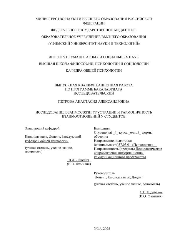 Петрова, Анастасия Александровна. Исследование взаимосвязи фрустрации и гармоничность взаимоотношений у студентов: выпускная квалификационная работа по программе бакалавриата. Направление подготовки: 37.03.01-Психология. Направленность (профиль): Психологическое сопровождение информационно-коммуникационного пространства / А.А. Петрова; Уфимский университет науки и технологий, Высшая школа философии, психологии и социологии, ИГСН; Кафедра общей психологии ; научный руководитель С.В. Щербаков. — Уфа, 2025. — 86 с.: ил. — <URL:https://elib.bashedu.ru/dl/diplom/2025/Petrova_AA_P-4PS211B_37.03.01_Psi_Sopr_Inf_Kom_Prostr_07.2025.pdf>. — Текст: электронный