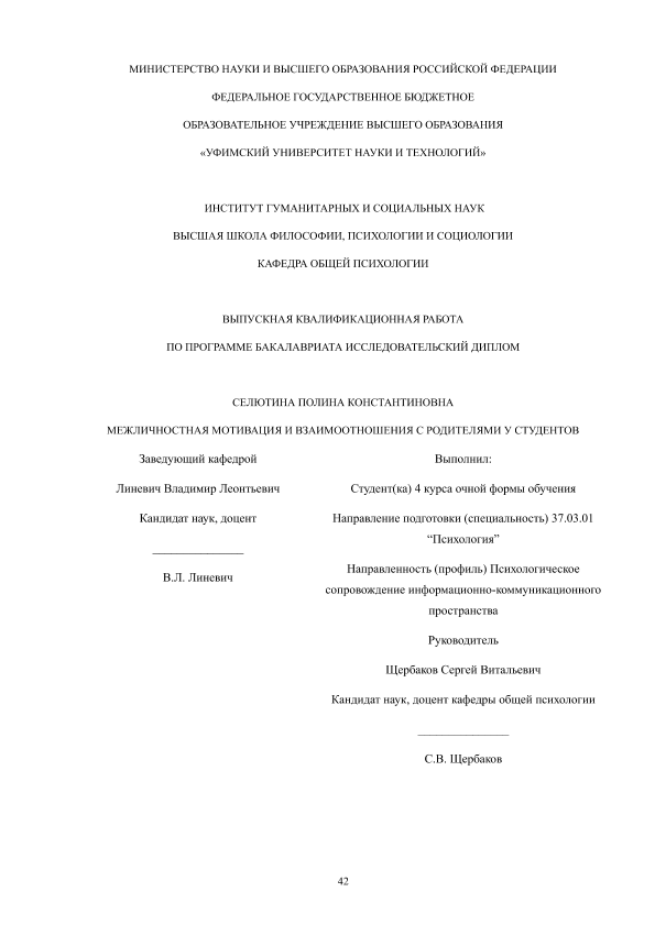 Селютина, Полина Константиновна. Межличностная мотивация и взаимоотношения с родителями у студентов: выпускная квалификационная работа по программе бакалавриата. Направление подготовки: 37.03.01-Психология. Направленность (профиль): Психологическое сопровождение информационно-коммуникационного пространства / П.К. Селютина; Уфимский университет науки и технологий, Высшая школа философии, психологии и социологии, ИГСН; Кафедра общей психологии ; научный руководитель С.В. Щербаков. — Уфа, 2025. — 47 с.: ил. — <URL:https://elib.bashedu.ru/dl/diplom/2025/Selyutina_PK_P-4PS211B_37.03.01_Psi_Sopr_Inf_Kom_Prostr_07.2025.pdf>. — Текст: электронный