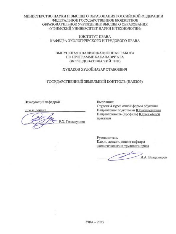 Худаков, Худойназар Отабоевич. Государственный земельный контроль (надзор): выпускная квалификационная работа бакалавра; направление подготовки (специальность) 40.03.01 Юриспруденция; направленность (профиль): Юрист общей практики / Х.О. Худаков; Уфимский университет науки и технологий, Институт права, Кафедра экологического и трудового права; научный руководитель: И.А. Владимиров. — Уфа, 2025. — 73 с.: ил. — <URL:https://elib.bashedu.ru/dl/diplom/2025/Khudakov_KhO_40.03.01_jurisprudence_bak_2025.pdf>. — текст: электронный