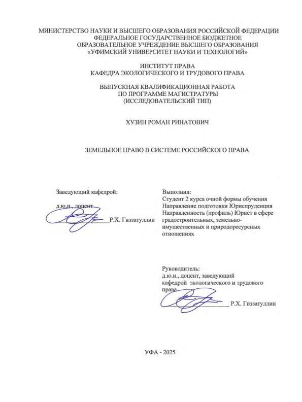 Хузин, Роман Ринатович. Земельное право в системе российского права: выпускная квалификационная работа по программе магистратуры; направление подготовки (специальность) 40.04.01 Юриспруденция; направленность (профиль): Юрист в сфере градостроительных, земельно-имущественных и природоресурсных отношений / Р.Р. Хузин; Уфимский университет науки и технологий, Институт права, Кафедра экологического и трудового права; научный руководитель: Р.Х. Гиззатуллин. — Уфа, 2025. — 89 с.: ил. — <URL:https://elib.bashedu.ru/dl/diplom/2025/Khuzin_RR_40.04.01_jurisprudence_mag_2025.pdf>. — текст: электронный