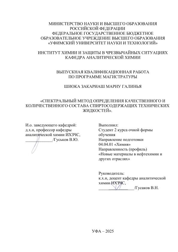 Шиока, Закариаш Мариу Галинья. Спектральный метод определения качественного и количественного состава спиртосодержащих технических жидкостей: выпускная квалификационная работа по программе магистратура. Направление подготовки (специальность): 04.04.01 "Химия". Направленность (профиль): "Новые материалы в нефтехимии и других отраслях" / Шиока Закариаш Мариу Галинья; Уфимский университет науки и технологий (УУНиТ), Институт химии и защиты в чрезвычайных ситуациях, Кафедра аналитической химии ; научный руководитель В. Н. Гусаков. — Уфа, 2025. — 92 с. — <URL:https://elib.bashedu.ru/dl/diplom/2025/Chioca_ZMG_2NM201_M_04.04.01_Khimiya_06.2025.pdf>. — Текст: электронный