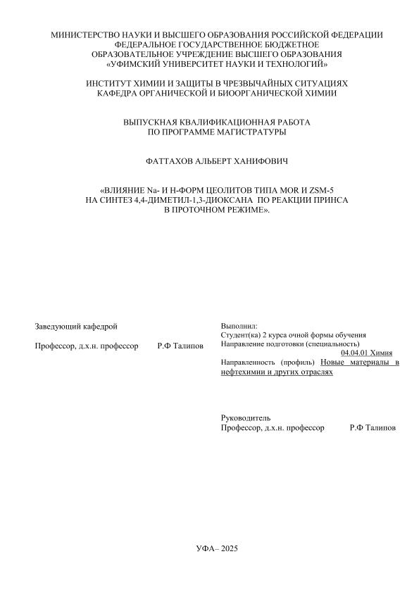 Фаттахов, Альберт Ханифович. Влияние Na- и H-форм цеолитов типа MOR и ZSM-5 на синтез 4,4-диметил-1,3-диоксана по реакции Принса в проточном режиме: выпускная квалификационная работа по программе магистратура. Направление подготовки (специальность): 04.04.01 "Химия". Направленность (профиль): "Новые материалы в нефтехимии и других отраслях" / А.Х. Фаттахов; Уфимский университет науки и технологий (УУНиТ), Институт химии и защиты в чрезвычайных ситуациях, Кафедра органической и биоорганической химии ; научный руководитель Р.Ф. Талипов. — Уфа, 2025. — 56 с. — <URL:https://elib.bashedu.ru/dl/diplom/2025/Fattakhov_A_Kh_2NM201М_04.04.01_Khimiya_06.2025.pdf>. — Текст: электронный