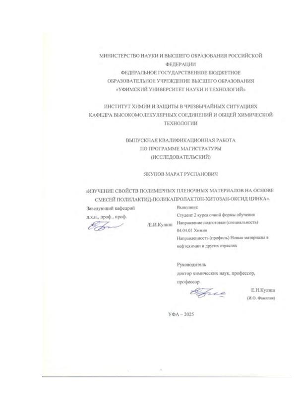 Якупов, Марат Русланович. Изучение свойств полимерных пленочных материалов на основе смесей полилактид-поликапролактон-хитозан-оксид цинка: выпускная квалификационная работа по программе магистратуры. Направление подготовки 04.04.01 Химия . Направленность (профиль): Новые материалы в нефтехимии и других отраслях / М.Р. Якупов; Уфимский университет науки и технологий, Институт химии и защиты в чрезвычайных ситуациях; Кафедра высокомолекулярных соединений и общей химической технологии; ; научный руководитель: Е.И. Кулиш. — Уфа, 2025. — 107 с.: ил. — <URL:https://elib.bashedu.ru/dl/diplom/2025/Yakupov_MR_2NM201M_04.04.01_Кhimiya_06.2025.pdf>. — Текст: электронный