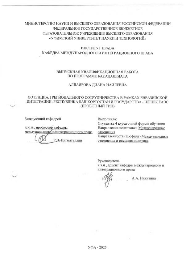 Аллаярова, Диана Наилевна. Потенциал регионального сотрудничества в рамках евразийской интеграции: Республика Башкортостан и государства - члены ЕАЭС (проектная): выпускная квалификационная работа по программе бакалавриата. Направление подготовки (специальность): 41.03.05 "Международные отношения". Направленность (профиль): "Международные отношения и внешняя политика" / Д. Н. Аллаярова; Уфимский университет науки и технологий, Институт права, Кафедра международного и интеграционного права; научный руководитель А. А. Никитина. — Уфа, 2025. — 61 с. — <URL:https://elib.bashedu.ru/dl/diplom/2025/Allayarova D.N. MO-4MO212B 41.03.05. Mezhdunarodnye otnosheniya.pdf>. — Текст: электронный