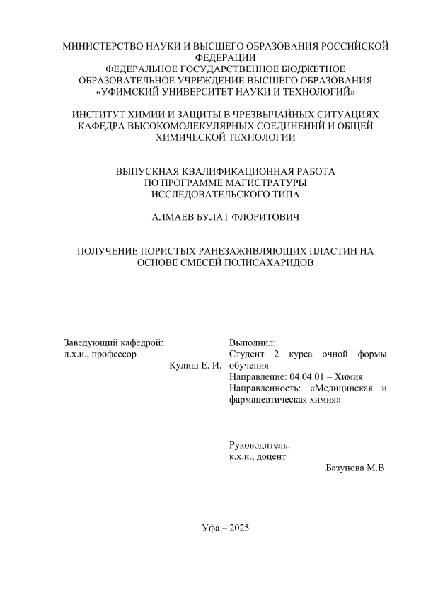 Алмаев, Булат Флоритович. Получение пористых ранезаживляющих пластин на основе смесей полисахаридов: выпускная квалификационная работа по программе магистратуры. Направление подготовки (специальность) 04.04.01 "Химия". Направленность (профиль) «Медицинская и фармацевтическая химия» / Б.Ф. Алмаев; Уфимский университет науки и технологий, Институт химии и защиты в чрезвычайных ситуациях, Кафедра высокомолекулярных соединений и общей химической технологии ; научный руководитель М. В. Базунова. — Уфа, 2025. — 75 с. — <URL:https://elib.bashedu.ru/dl/diplom/2025/Almaev_BF_2MFH201M_04.04.01_Khimiya_06.2025.pdf>. — Текст: электронный