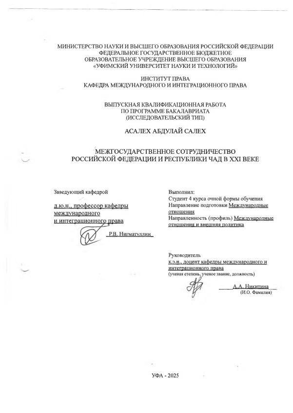Асалех, Абдулай Салех. Межгосударственное сотрудничество российской федерации и Республики Чад в XXI веке: выпускная квалификационная работа по программе бакалавриата. Направление подготовки (специальность): 41.03.05 "Международные отношения". Направленность (профиль): "Международные отношения и внешняя политика" / А. С. Асалех; Уфимский университет науки и технологий, Институт права, Кафедра международного и интеграционного права; научный руководитель А. А. Никитина. — Уфа, 2025. — 61 с. — <URL:https://elib.bashedu.ru/dl/diplom/2025/Asalekh A.S. MO-4MO212B 41.03.05. Mezhdunarodnye otnosheniya.pdf>. — Текст: электронный