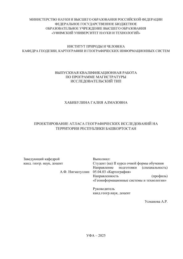 Хабибуллина, Галия Алмазовна. Атлас географических исследований Республики Башкортостан: выпускная квалификационная работа по программе магистратура. Направление подготовки (специальность) 05.04.03 "Картография". Направленность (профиль): "Геоинформационные системы и технологии" / Г.А. Хабибуллина; Уфимский университет науки и технологий, Институт природы и человека, Кафедра геодезии, картографии и географических информационных систем ; научный руководитель А.Р. Усманова. — Уфа, 2025. — 63 с. — <URL:https://elib.bashedu.ru/dl/diplom/2025/Habibulina_GA_KG-GIS-201M_05.04.03_Cartography_05_2025.pdf>. — Текст: электронный