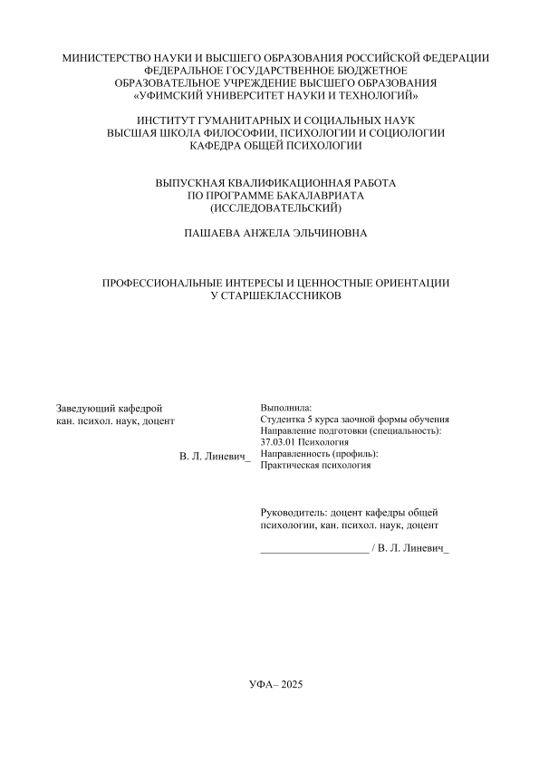 Пашаева, Анжела Эльчиновна. Профессиональные интересы и ценностные ориентации у старшеклассников: выпускная квалификационная работа по программе бакалавриата. Направление подготовки (специальность) 37.03.01 "Психология". Направленность (профиль) "Практическая психология" / А.Э. Пашаева; Уфимский университет науки и технологий, Высшая школа философии, психологии и социологии, ИГСН; Кафедра общей психологии ; научный руководитель В.Л. Линевич. — Уфа, 2025. — 75 с. — <URL:https://elib.bashedu.ru/dl/diplom/2025/Pashaeva_AE_P-5PP202Bz_37.03.01_Prakt_Psy_07.2025.pdf>. — Текст: электронный