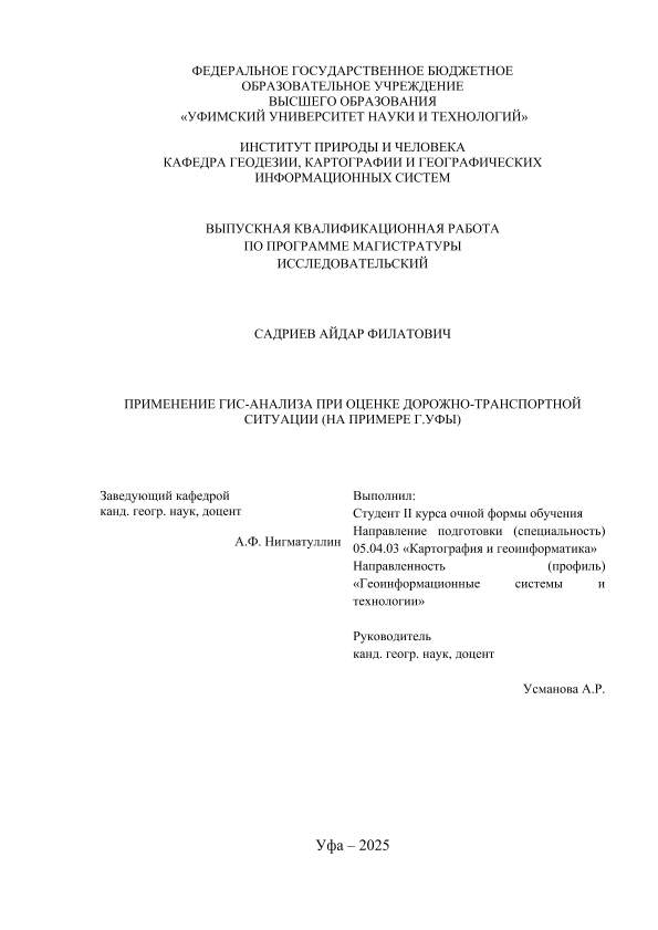 Садриев, Айдар Филатович. Применение ГИС-анализа при оценке дорожно-транспортной ситуации (на примере г. Уфы): выпускная квалификационная работа по программе магистратура. Направление подготовки (специальность) 05.04.03 "Картография". Направленность (профиль): "Геоинформационные системы и технологии" / А.Ф.Садриев; Уфимский университет науки и технологий, Институт природы и человека, Кафедра геодезии, картографии и географических информационных систем ; научный руководитель А.Р. Усманова. — Уфа, 2025. — 73 с. — <URL:https://elib.bashedu.ru/dl/diplom/2025/Sadriev_AF_KG-GIS-201M_05.04.03_Cartography_05_2025.pdf>. — Текст: электронный