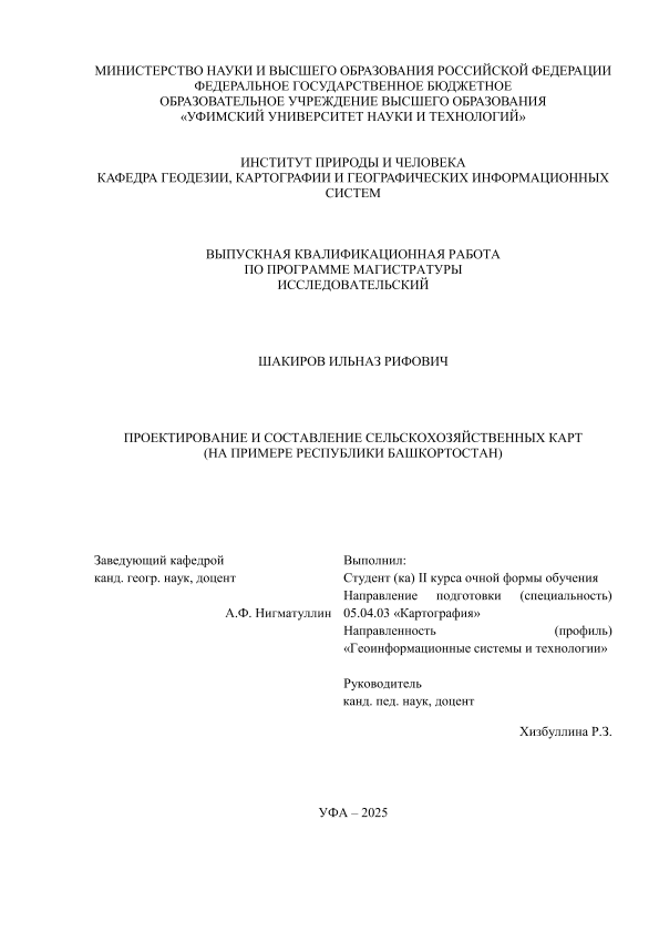 Шакиров, Ильназ Рифович. Проектирование и составление сельскохозяйственных карт (на примере Республики Башкортостан): выпускная квалификационная работа по программе магистратура. Направление подготовки (специальность) 05.04.03 "Картография". Направленность (профиль): "Геоинформационные системы и технологии" / И.Р. Шакиров; Уфимский университет науки и технологий, Институт природы и человека, Кафедра геодезии, картографии и географических информационных систем ; научный руководитель Р.З. Хизбуллина. — Уфа, 2025. — 88 с. — <URL:https://elib.bashedu.ru/dl/diplom/2025/Shakirov_IR_KG-GIS-201M_05.04.03_Cartography_05_2025.pdf>. — Текст: электронный