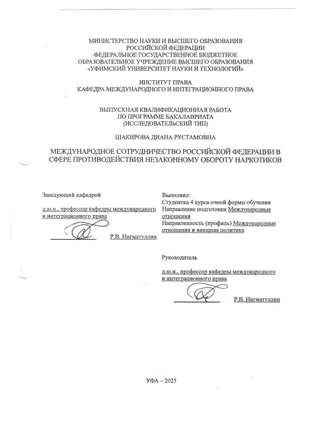 Шакирова, Диана Рустамовна. Международное сотрудничество российской федерации в сфере противодействия незаконному обороту наркотиков: выпускная квалификационная работа по программе бакалавриата. Направление подготовки (специальность): 41.03.05 "Международные отношения". Направленность (профиль): "Международные отношения и внешняя политика" / Д. Р. Шакирова; Уфимский университет науки и технологий, Институт права, Кафедра международного и интеграционного права; научный руководитель Р. В. Нигматуллин. — Уфа, 2025. — 74 с. — <URL:https://elib.bashedu.ru/dl/diplom/2025/Shakirova D.R. MO-4MO211B 41.03.05. Mezhdunarodnye otnosheniya.pdf>. — Текст: электронный