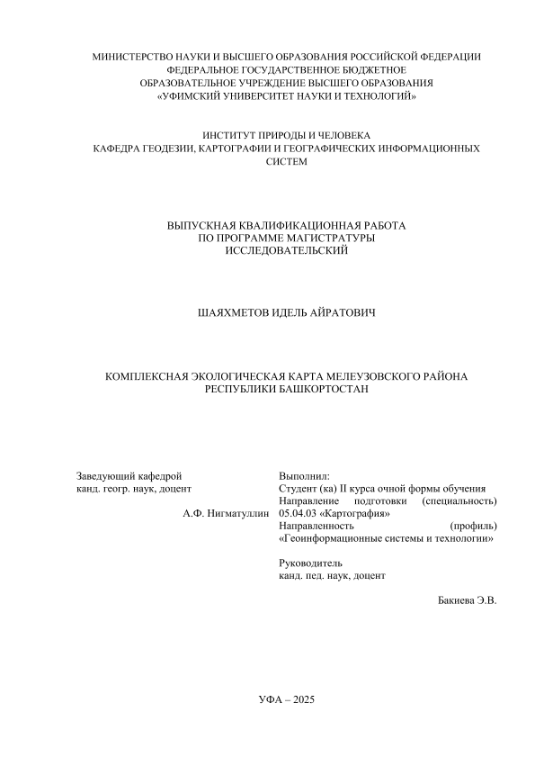 Шаяхметов, Идель Айратович. Комплексная экологическая карта Мелеузовского района Республики Башкортостан: выпускная квалификационная работа по программе магистратура. Направление подготовки (специальность) 05.04.03 "Картография". Направленность (профиль): "Геоинформационные системы и технологии" / И.А. Шаяхметов; Уфимский университет науки и технологий, Институт природы и человека, Кафедра геодезии, картографии и географических информационных систем ; научный руководитель Э.В. Бакиева. — Уфа, 2025. — 67 с. — <URL:https://elib.bashedu.ru/dl/diplom/2025/Shayakhmetov_IA_KG-GIS-201M_05.04.03_Cartography_05_2025.pdf>. — Текст: электронный